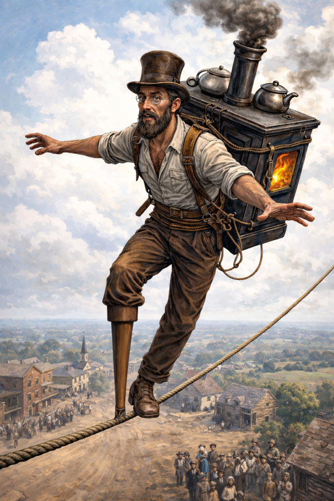 People came from all over to watch. Practically everyone in town lined the sidewalks. This was 1884. There was no television, no radio, no movie theater. A one-legged man crossing a tightrope with a stove on his back was about as good as entertainment got.